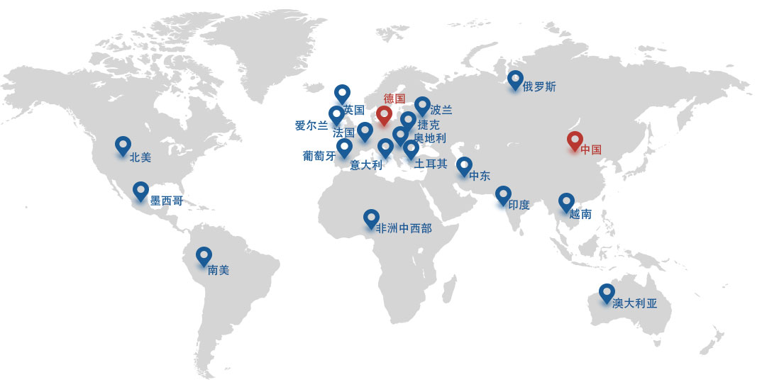總部德國,全球子公司及辦事處:英國、愛爾蘭、法國、澳大利亞、中東、新加坡、俄羅斯、印度、奧地利、非洲中西部、意 大利、墨西哥、荷蘭、北美、南美、波蘭、捷克、葡萄牙、土耳其、越南、中國等34個國家級地區(qū)