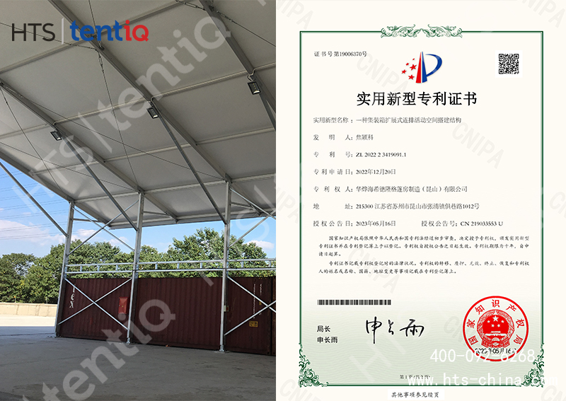 華燁海希德隆格篷房制造(昆山)有限公司研發(fā)出一種集裝箱擴(kuò)展式連排活動(dòng)空間搭建結(jié)構(gòu)設(shè)計(jì),并向國家知識產(chǎn)權(quán)局申請專利,經(jīng)過審查、登記等流程,該專利順利獲得認(rèn)定,國家知識產(chǎn)權(quán)局授予華燁篷房“一種集裝箱擴(kuò)展式連排活動(dòng)空間搭建結(jié)構(gòu)”實(shí)用新型專利證書。