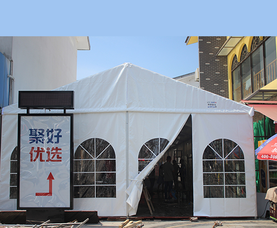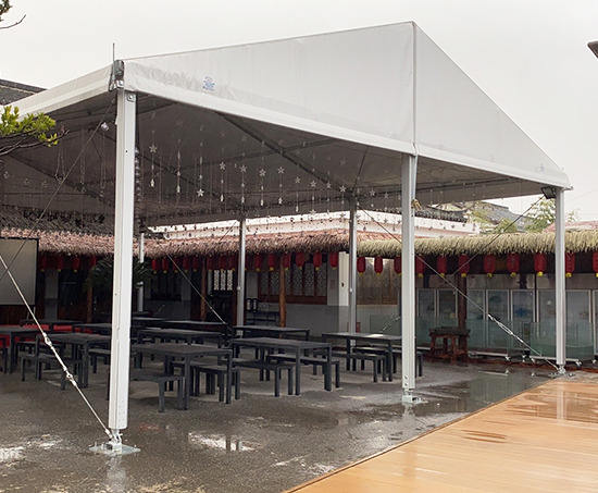 結合客戶實地空間的大小推薦了寬度10米,長度14米,高度4米的一座多功能篷房,因為客戶場地是水泥地,當時客戶定下來以后,我們華燁就加單生產,直接運送到客戶場地,當天還是下雨天,把一些花花草草先是更換位置,進行搭建,總共是1天時間。