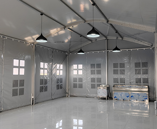 寬度5.8米,長度20米的工廠餐飲篷房。考慮到一側邊墻臨靠廠內圍欄及廠外道路,給的方案就是這個邊墻做的是鋁合金框+ABS板,另外三個面做玻璃墻,一個邊墻配了兩個雙開門及雨拱。考慮到夏天吃飯比較熱,屋頂配了雙層篷布,用來隔熱。