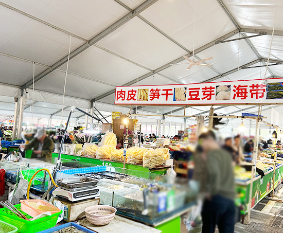 這2座菜市場篷房規格是一樣的,寬度為8米,長度30米,高度4米,四周選用ABS板墻體,頂棚采用PVC篷布。選用這個配置主要是解決保溫、防盜的功能,像這種500平方以內的小篷房,1天即可搭建完畢,連夜經營者就可以入駐了。