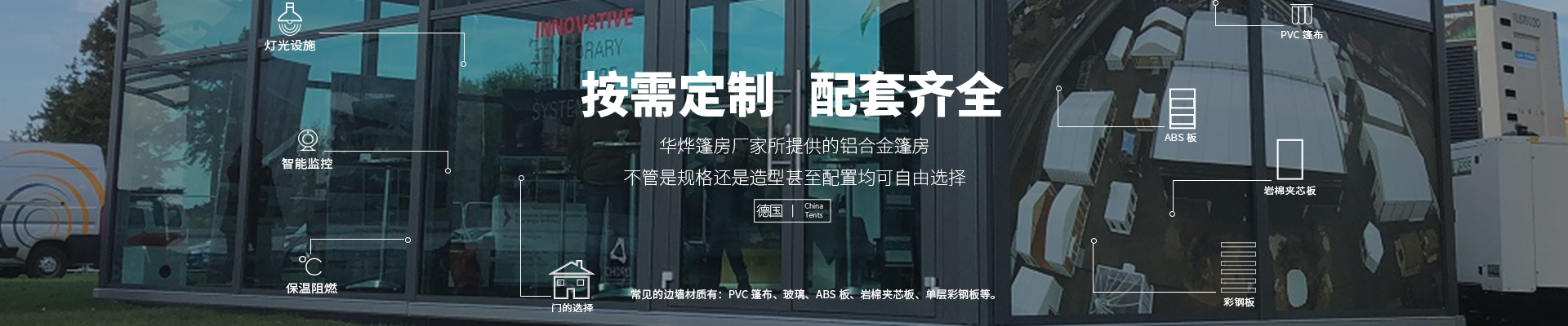 篷房主體分為框架、頂篷以及四周邊墻,邊墻事獨立的,你可以選擇它的材質,也可以選擇要不要安裝邊墻,它主要起到圍擋的作用,不同用途下需要 選擇不同的邊墻材質,常見的邊墻材質有:PVC篷布、玻璃、ABS板、巖棉夾芯板、單層彩鋼板等。
